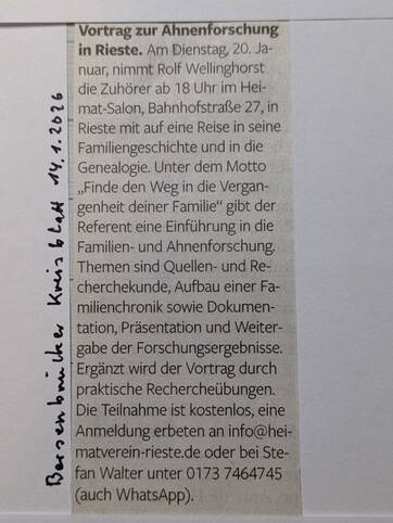 Vortrag: "60 Jahre Ahnenforschung als Hobby – Von unserer Verwandtschaft mit Taylor Swift bis zur Verwandtschaft der Berger Tuchhändlerfamilien" am 25.3.2026 um 19.00 Uhr im Heimathaus Berge