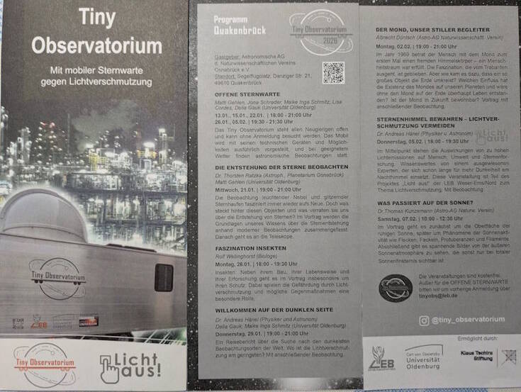 Das Tiny Observatorium – Mit mobiler Sternwarte gegen Lichtverschmutzung, unter dieser Überschrift findet vom 13.1. bis 7.2. die vorstehende Veranstaltungsreihe auf dem Segelflugplatz Quakenbrück statt. Rolf Wellinghorst wird in seinem Vortrag "Faszination Insekten" auch auf die nachtaktiven Insekten und ihre Probleme mit der Lichtverschmutzung eingehen.
